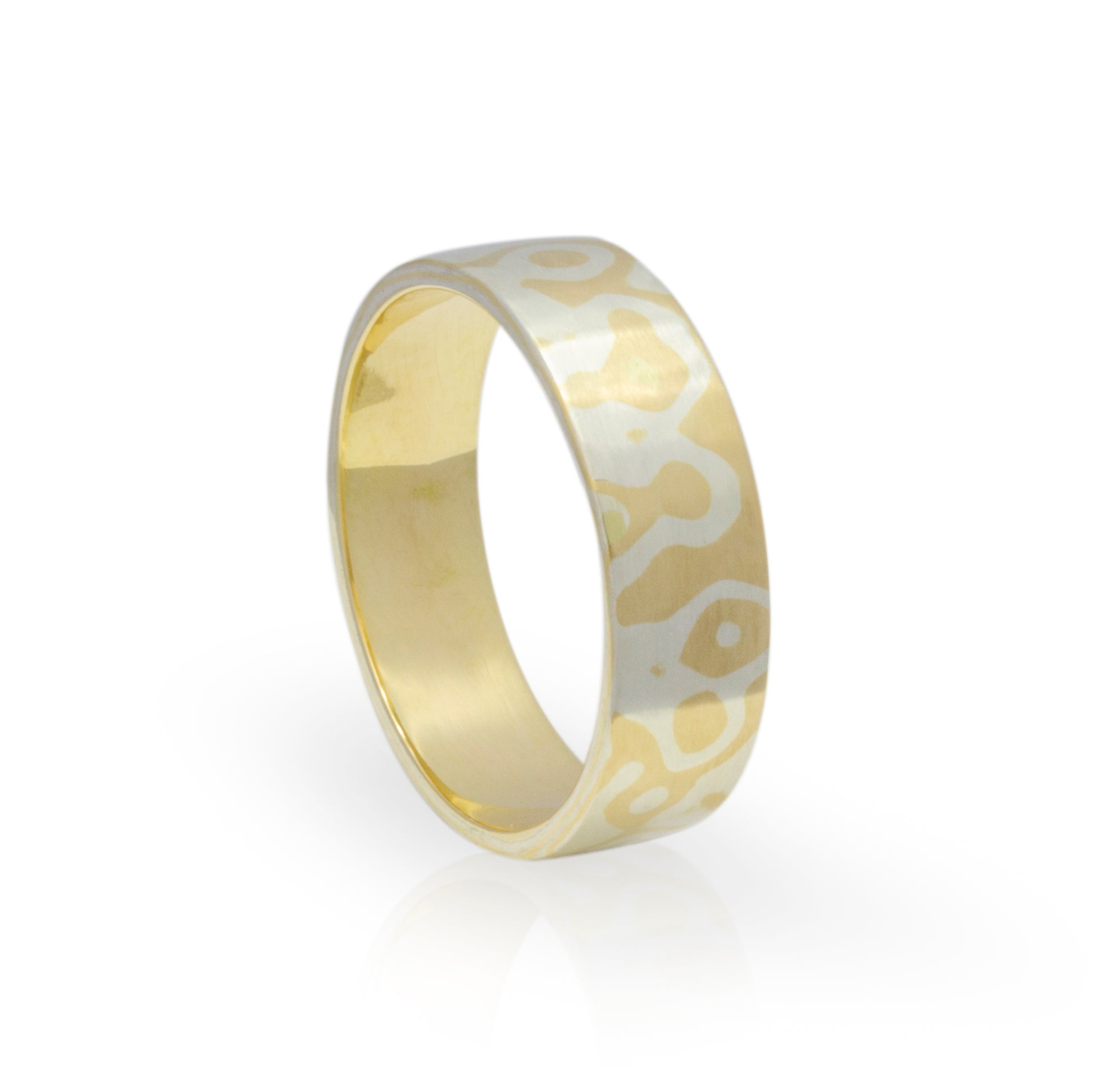 Deze Mokume-gane ring is vervaardigd uit 14k geelgoud en 1e gehalte zilver. Het contrast tussen de metalen wordt nog versterkt door de natuurlijke verkleuring van het zilver, afhankelijk van uw huidtype. Bestel nu en maak kennis met deze opvallende smeedtechniek.