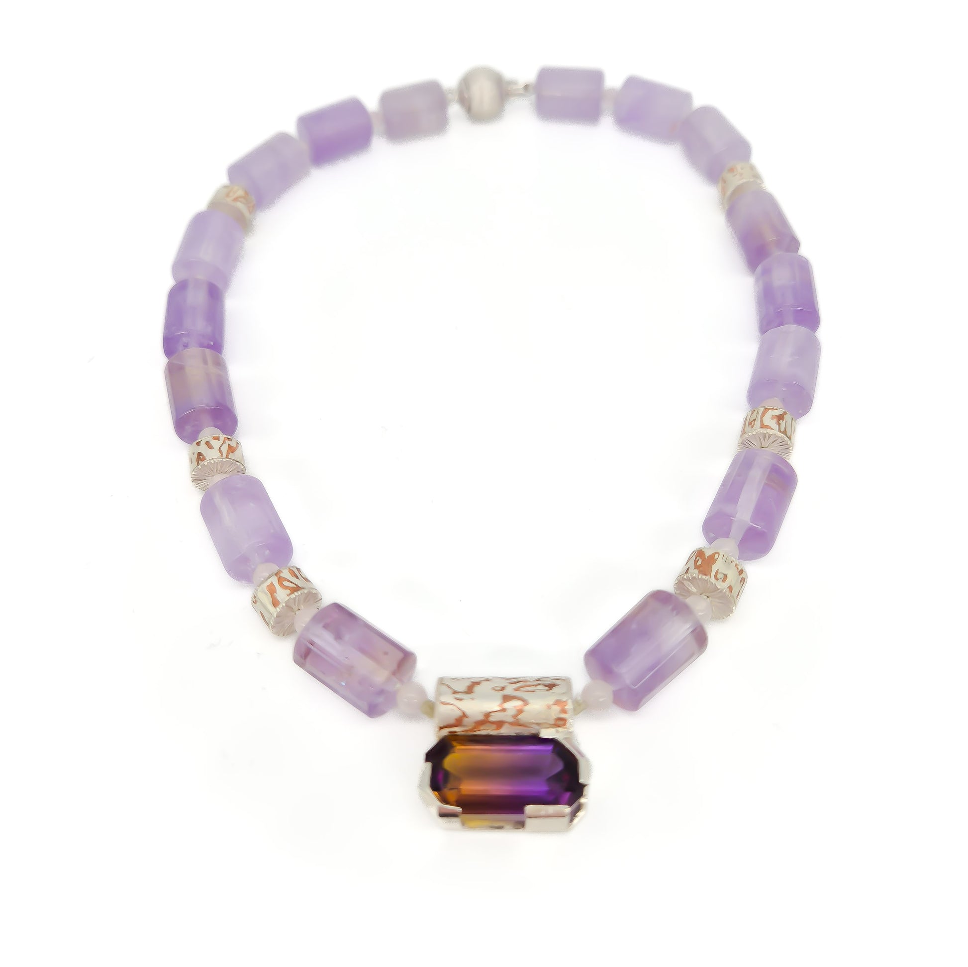 Het collier is gemaakt van natuurlijke amethist kralen, gecombineerd met kleine accenten van rozenkwarts. De blikvanger is een synthetische ametrien in het midden, met een mooie overgang van paars naar warm goudbruin.