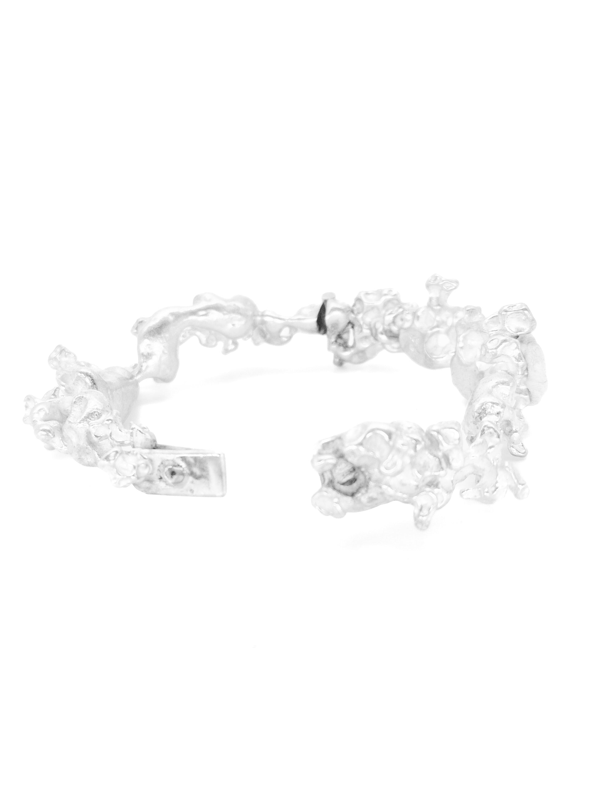 Deze sculpturale armband is volledig vervaardigd uit massief zilver en heeft een uitgesproken, organische vormgeving. Het oppervlak bestaat uit vloeiende, bijna natuurlijke structuren die samen een speels maar krachtig geheel vormen. Het ontwerp voelt robuust aan, maar blijft door de zachte lijnen elegant om de pols.