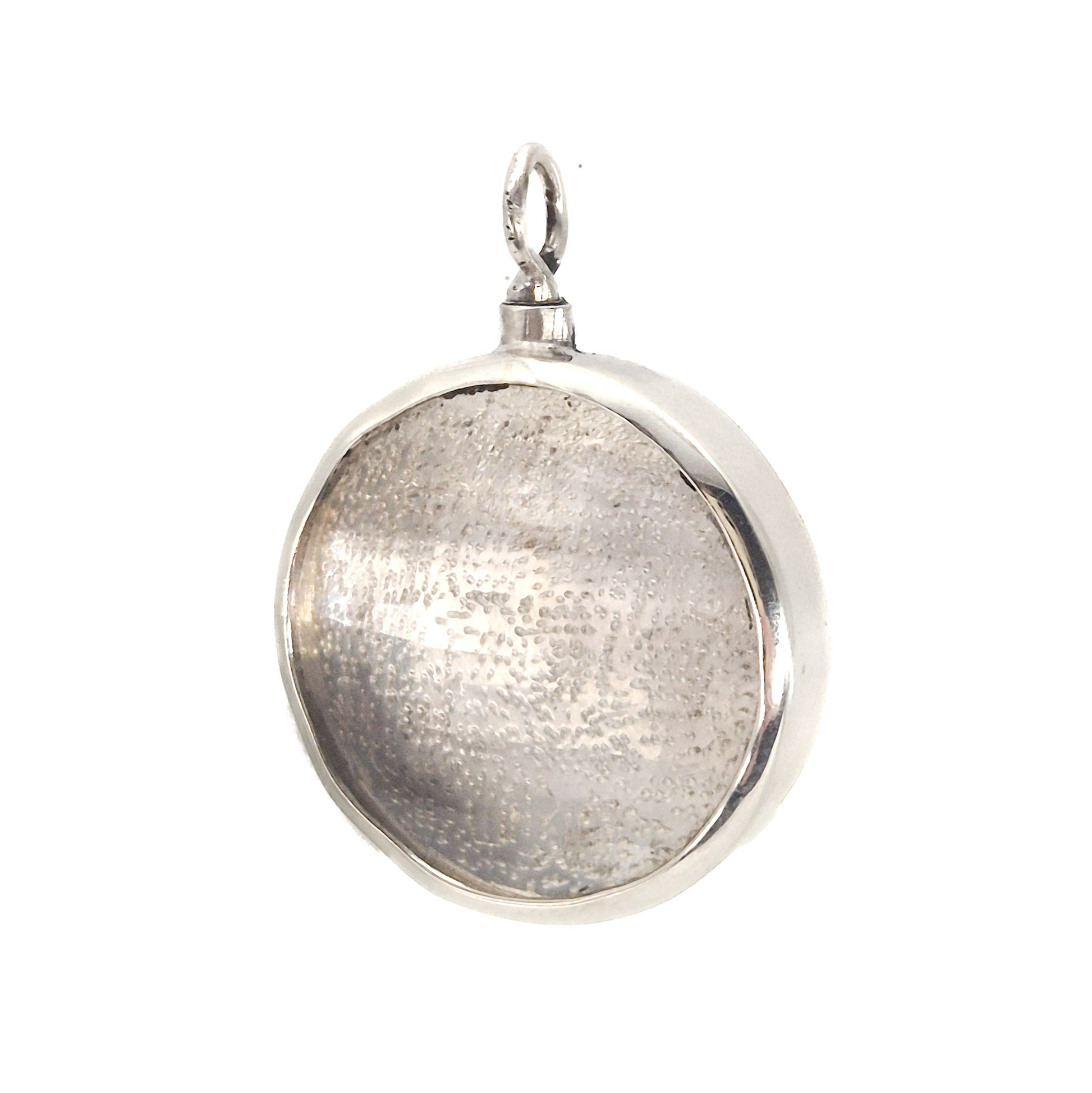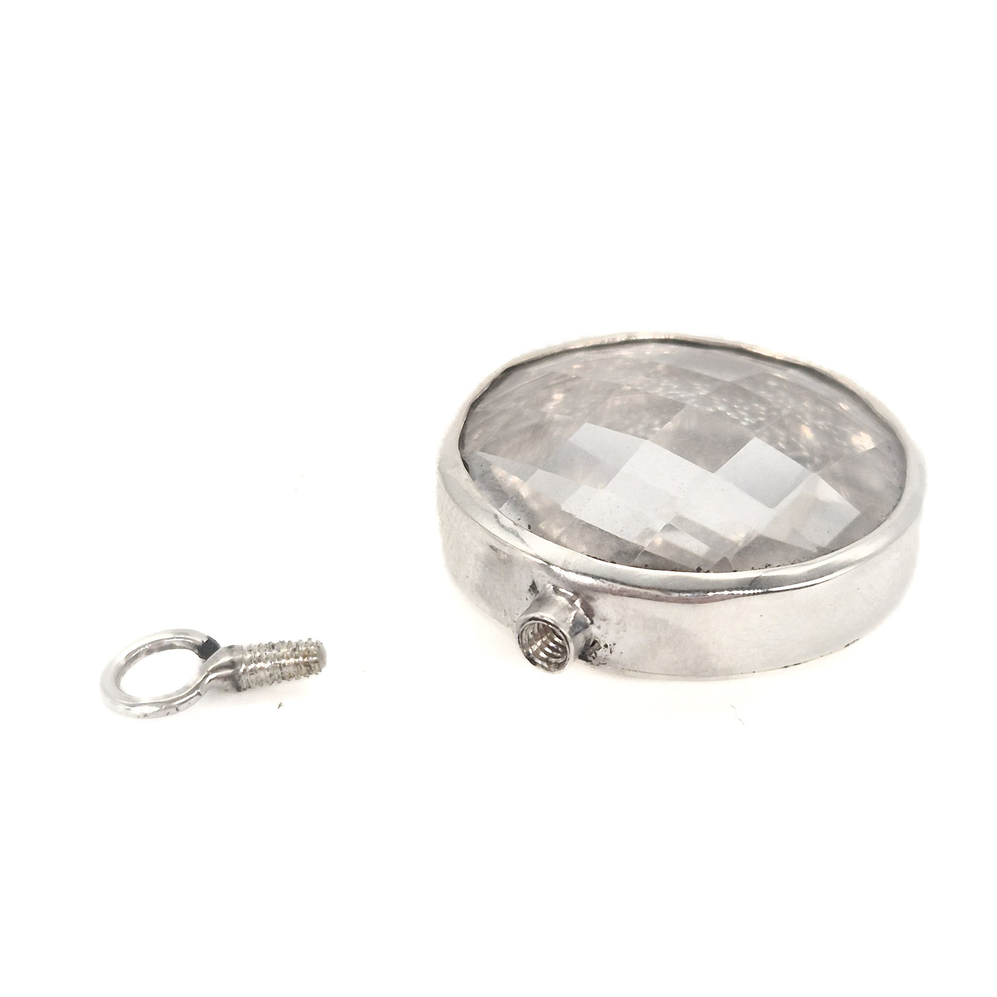 Deze zilveren hanger is gezet met een bergkristal dat in een checker cut slijpsel is uitgevoerd. Door de transparantie van de steen is de askamer zichtbaar, waardoor de inhoud subtiel te zien blijft.