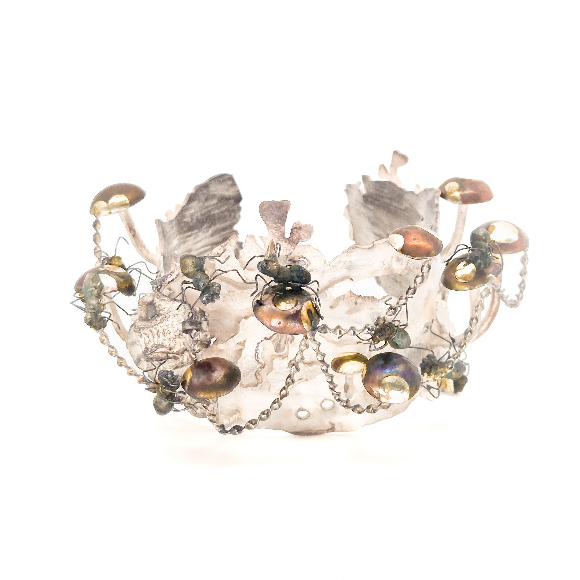 Deze bijzondere armband is een uniek, met de hand vervaardigd kunststuk, speciaal gemaakt voor de Silver Challenge in Schoonhoven. De armband is uitgevoerd in sterling zilver en verrijkt met koperen en 14 karaat geelgouden accenten. Samen vormen deze materialen een levendig en speels geheel, vol detail en verbeeldingskracht.