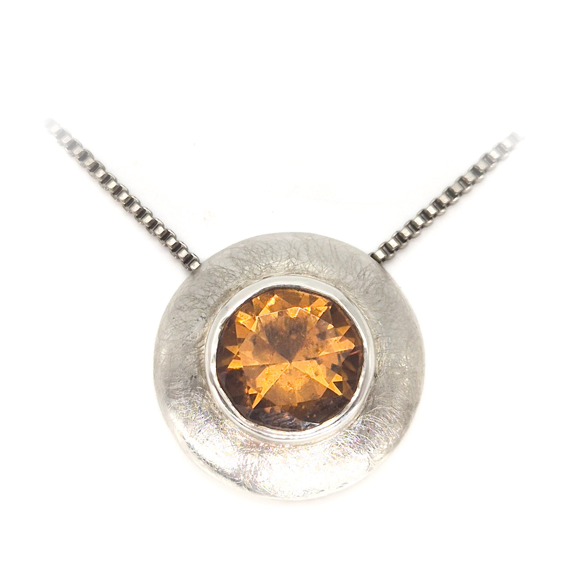 Een moderne hanger met karakter. Deze handgemaakte hanger is vervaardigd uit sterling zilver en gezet met een warme, honingkleurige citrien. De steen is geslepen in een aangepast briljantslijpsel, wat zorgt voor extra schittering en diepte in het licht.