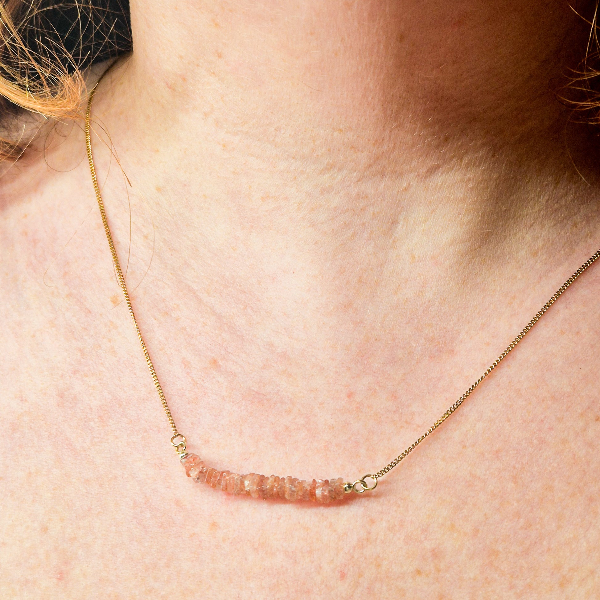 Dit verfijnde collier is uitgevoerd in 14 karaat geelgoud en afgewerkt met een rij zorgvuldig geselecteerde helioliet (zonnesteen). De warmroze tot perzikachtige tinten van de zonnesteen geven het sieraad een zachte gloed, die mooi contrasteert met het warme goud.