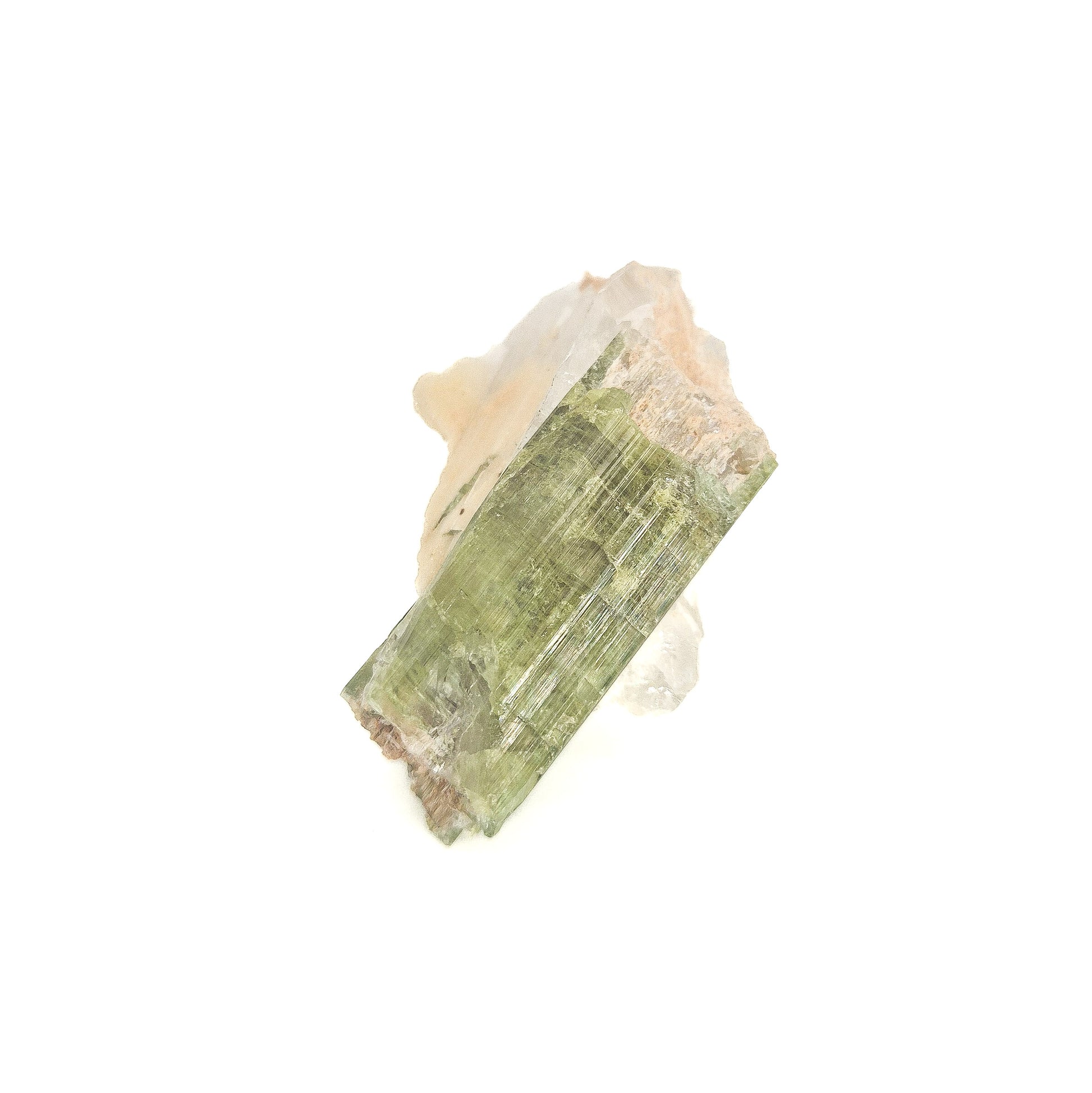Deze ruwe steen bestaat uit een duidelijk gevormd kristal van groene toermalijn dat schuin uit een matrix van licht kwarts tevoorschijn komt. Het toermalijnkristal is langgerekt en toont karakteristieke verticale groeilijnen, die de natuurlijke kristalstructuur benadrukken. De kleur varieert van zacht groen tot een iets diepere, warme groentint, afhankelijk van de lichtinval.