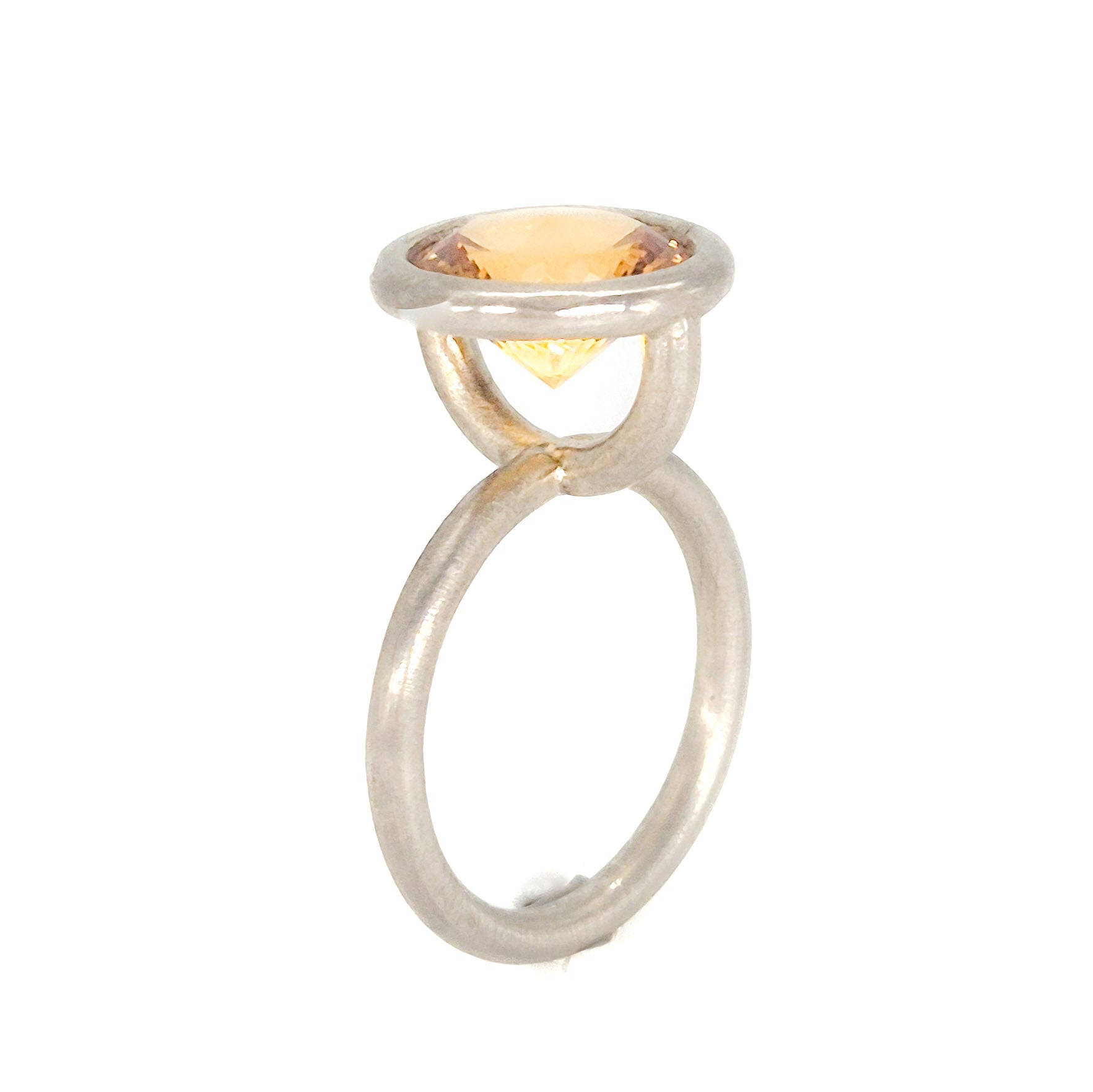 Deze handgemaakte ring is vervaardigd uit sterling zilver en gezet met een warme, honingkleurige citrien. De steen is geslepen in een aangepast briljantslijpsel, wat zorgt voor extra schittering en diepte in het licht.